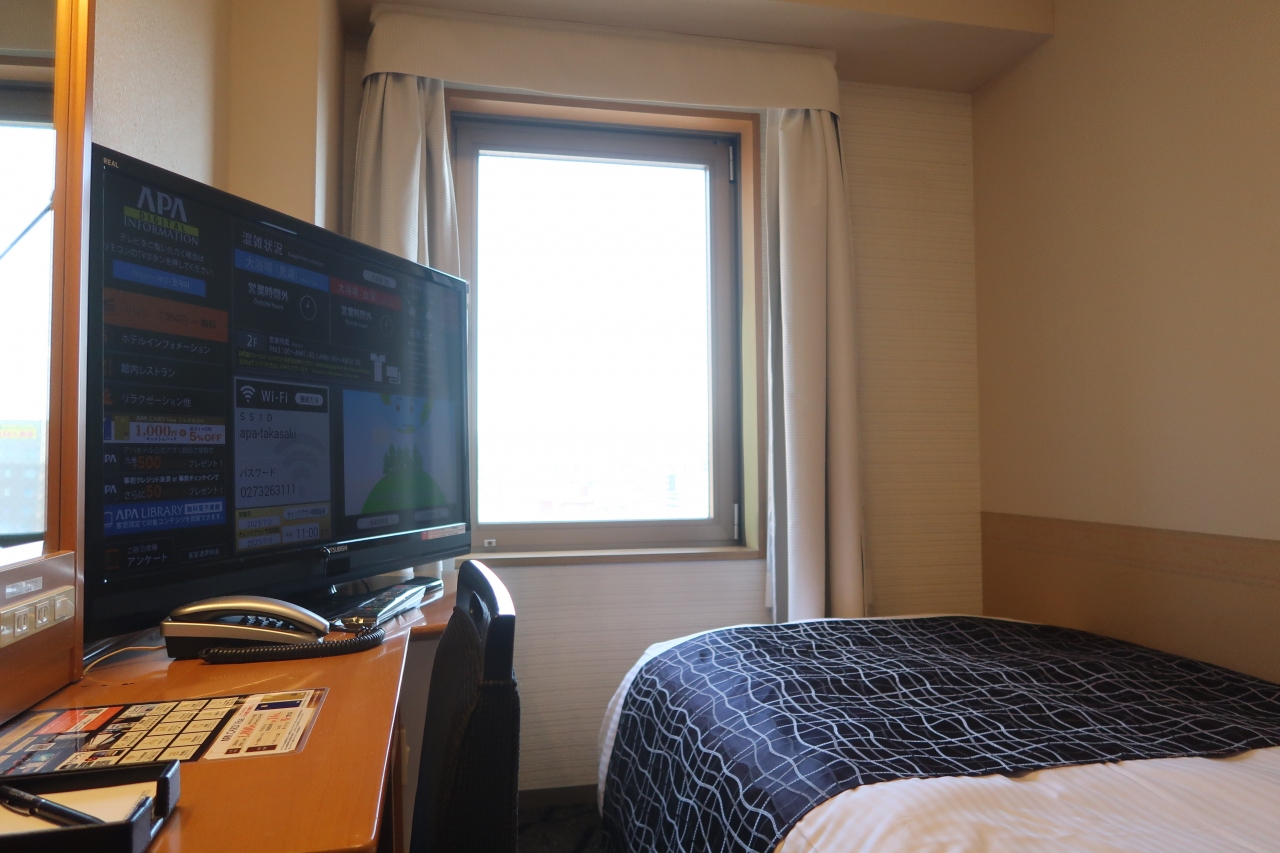 高崎駅西口から徒歩1分、デッキで直結していてアクセス抜群です。宿泊した客室はシングル/9平米と狭めですが、天然温泉の大浴場にはサウナ・水風呂も完備していてポイント高し。アメニティや設備は安定のアパ仕様で必要な物は最低限揃ってます。アパ直から予約してアプリチェックイン時に部屋指定するなら高崎駅とロータリーが望める北側の部屋がオススメですよ。
