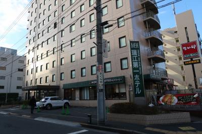 都営新宿線の瑞江駅地下ホームから改札を出て地上に出ると北口の目の前にあります。10階建てのホテルで1階に牛丼店とカフェが併設。古めのビジネスホテルですがフロントの対応は丁寧で好印象。宿泊したシングル約12平米の客室は清掃も行き届いていて、最上階の部屋で静かに過ごすことができました。周辺は飲食店が多く、コンビニ・スーパー・マツキヨ・ドンキもあり食事やちょっとした買い物にも便利ですよ。