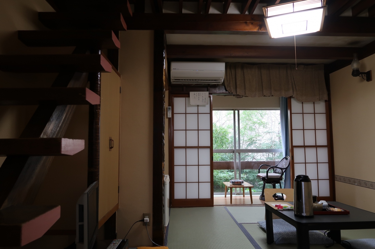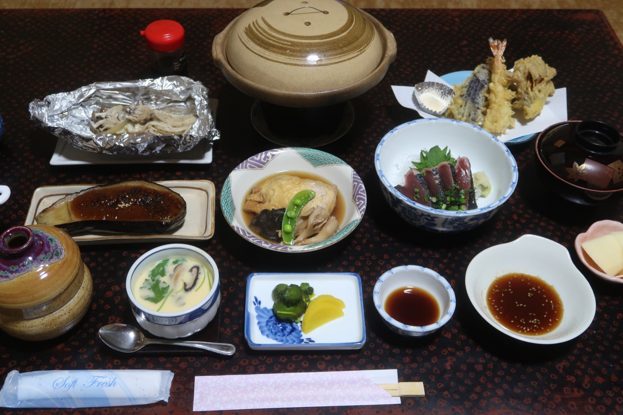 夕食はお刺身の他に料理がテーブルにドーン!と並びます。一名利用でしたが、人数が増えればより多くの種類のお刺身が用意されるそうです。客室は中2階があるロフト付のような珍しい部屋でした。大正時代の建物でトイレは共用。温泉は内湯のみですが夜中でも入浴可能なので滞在中は4回ほど利用しました。暑いさなか、チェックアウト時の冷たい缶コーヒーとお茶のサービスは嬉しかったです。