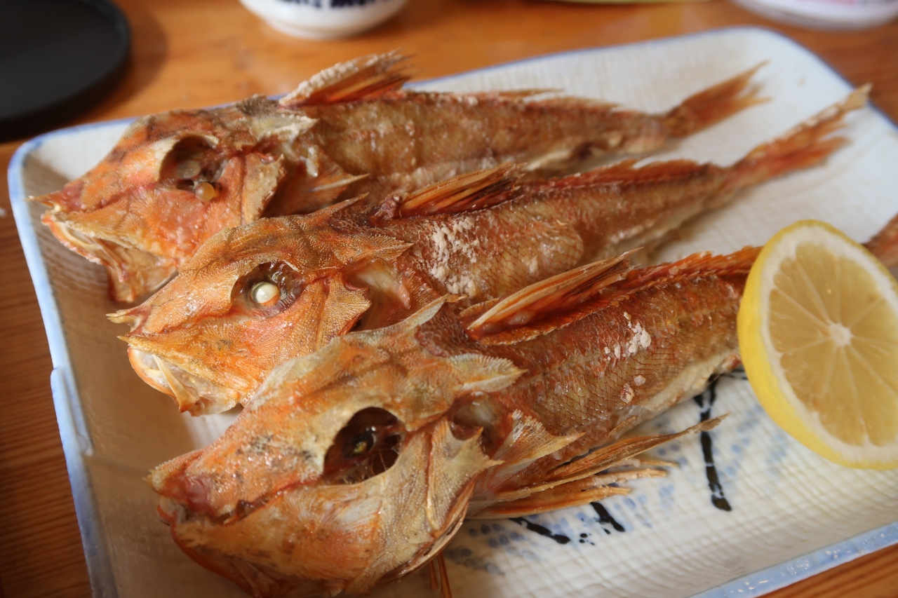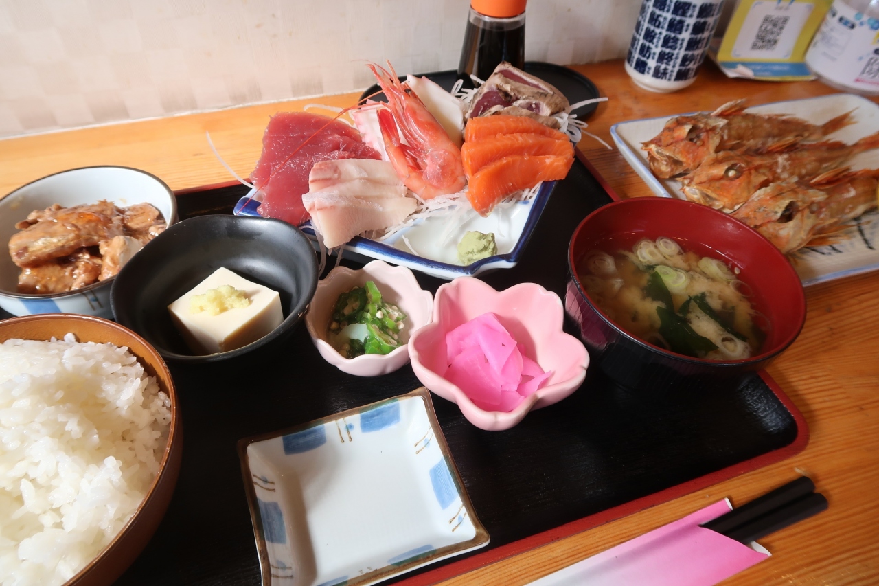 駅近で新鮮なお刺身をお腹いっぱい食べられる人気店で地元の常連客と観光客、ビジネス客でいつも賑わっています。平日の午後1時過ぎに入店、すんなりカウンター席へ。前回は10種類の刺身がてんこ盛りの海幸刺身定食を食べたので、今回は通常の刺身定食に焼き魚がセットになった海幸焼き魚定食をオーダー。この日の焼き魚はホウボウでした。こちらも見た目バッチリなボリューム感です。店員さんはいつもどおりの丁寧な接客で好印象。いわき湯本温泉を訪れる時は毎回利用しています。