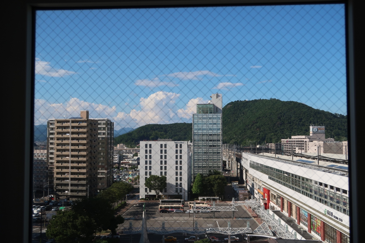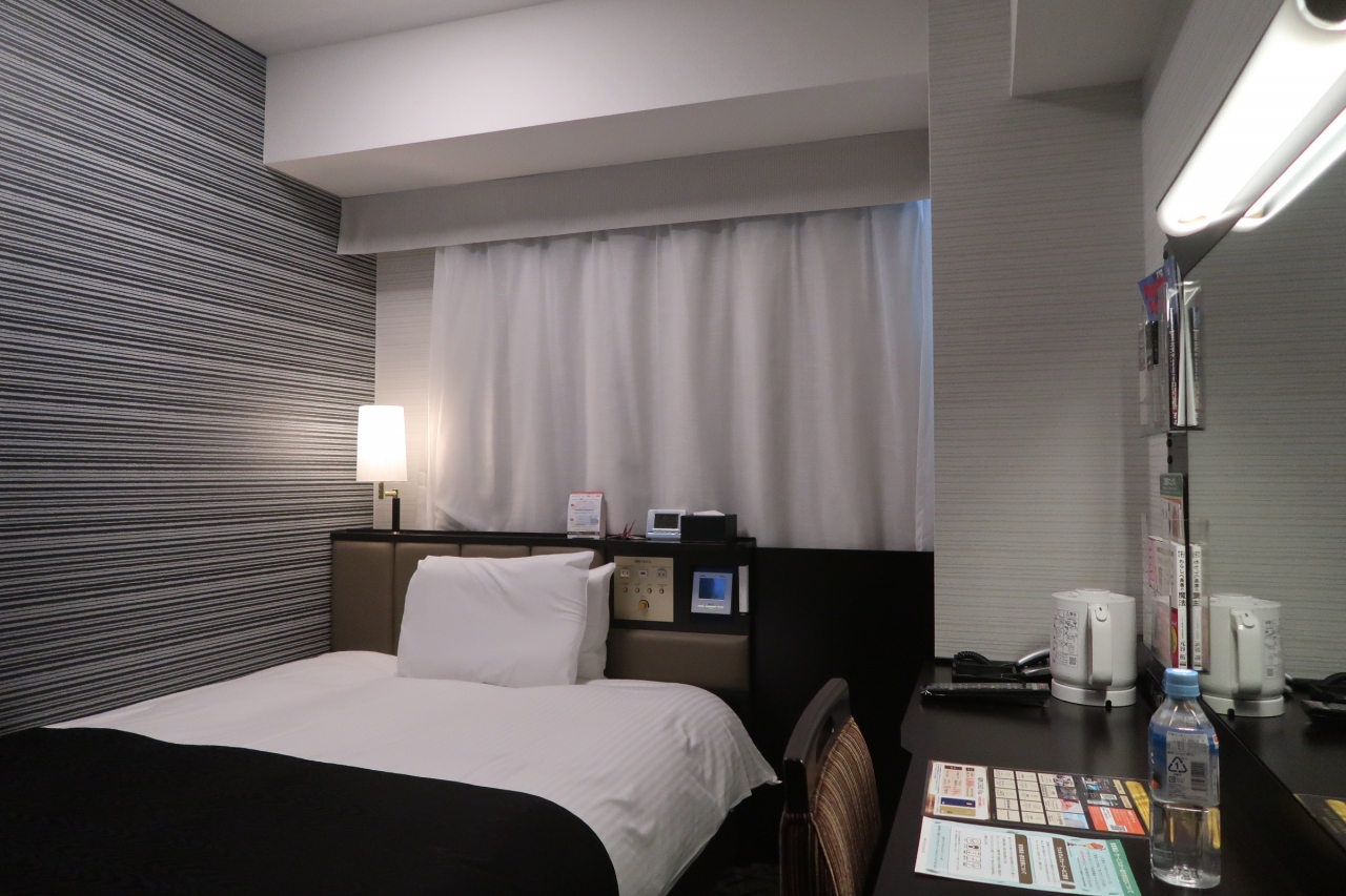福島駅西口から徒歩1分、14階建で近隣に高層建造物がないので眺めが良かったです。宿泊した客室はシングル/11平米、コンパクトですがベッド幅140cmでゆったり。アメニティや設備は安定のアパ仕様で必要な物は最低限揃ってます。アパ直から予約してアプリチェックイン時に部屋指定するなら北側の部屋からは福島駅とロータリーが、南側なら新幹線ビューが楽しめますよ。