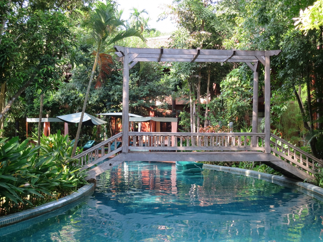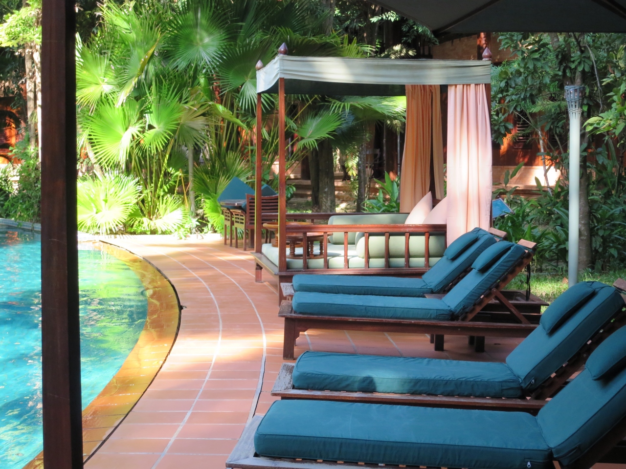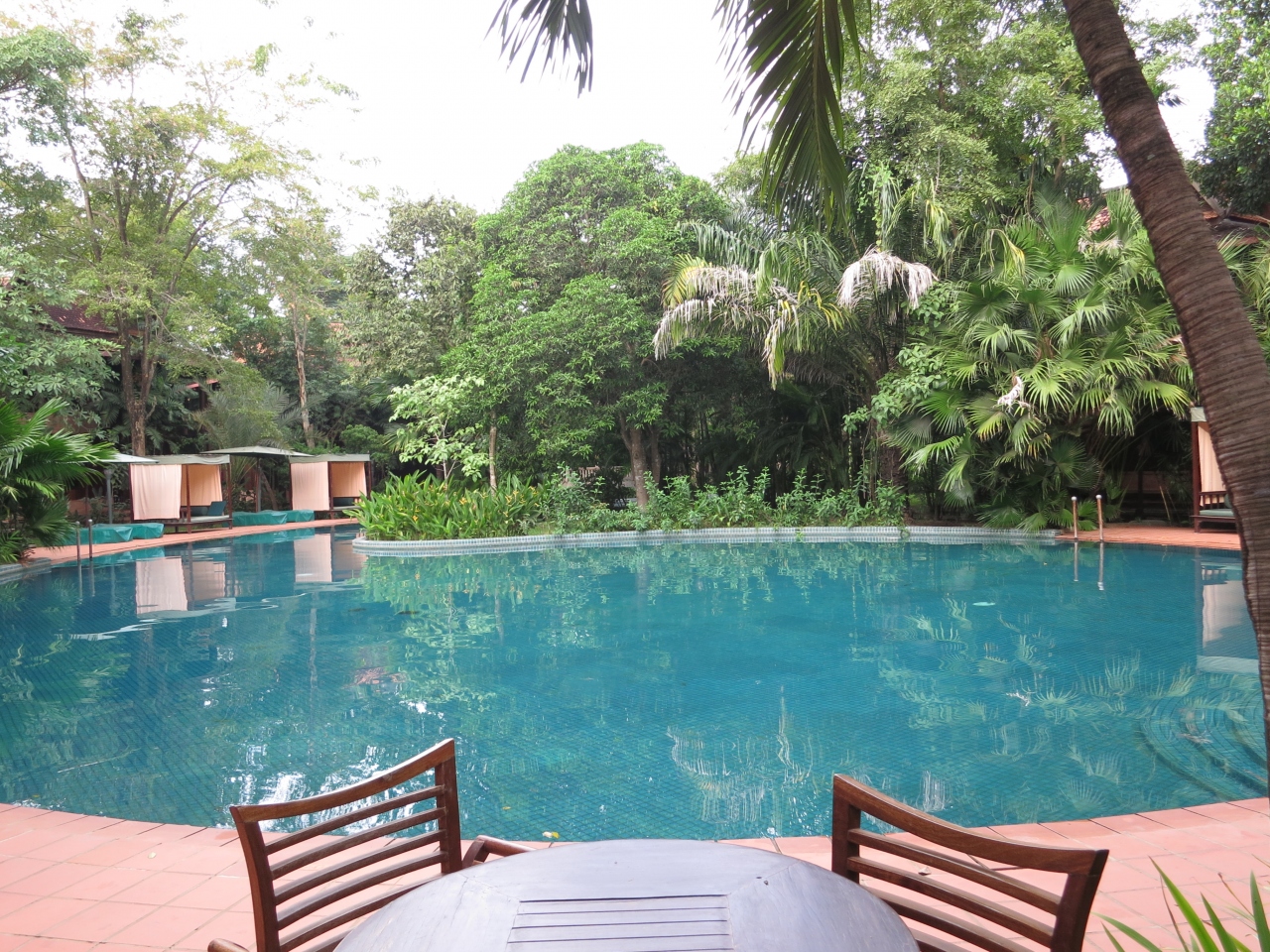 巨大なプールにほぼ全室プールビュー。それに追加料金が掛からないことを考えると非常にお得だと思う。部屋の前に専用のベッドがあり取り合いになることもない。プール沿いに歩けず区切られているので泳いでいる人以外に覗かれる心配がない。どこの部屋でも静かだと思う。料理の種類は少なめだが朝の混雑もなくゆっくりできる。蚊が非常に多く電気蚊取りは置いてあるがやはり刺される。これが最大の問題。バルコニーに陽が当たらないので洗濯が乾かない。Wifiがロビーのみ利用可だが弱い。ツアー利用だとアンコールワット近ホテルは有利。街までは片道3ドル。トゥクトゥクはホテル前に待機している。行った時はプールの先端部分でコテージを工事していたが付近には客を入れていない模様