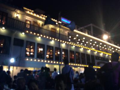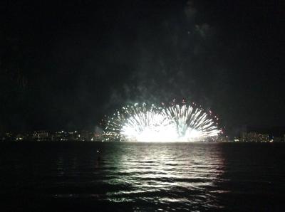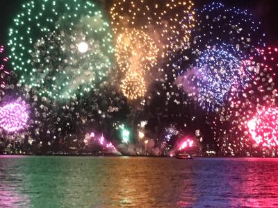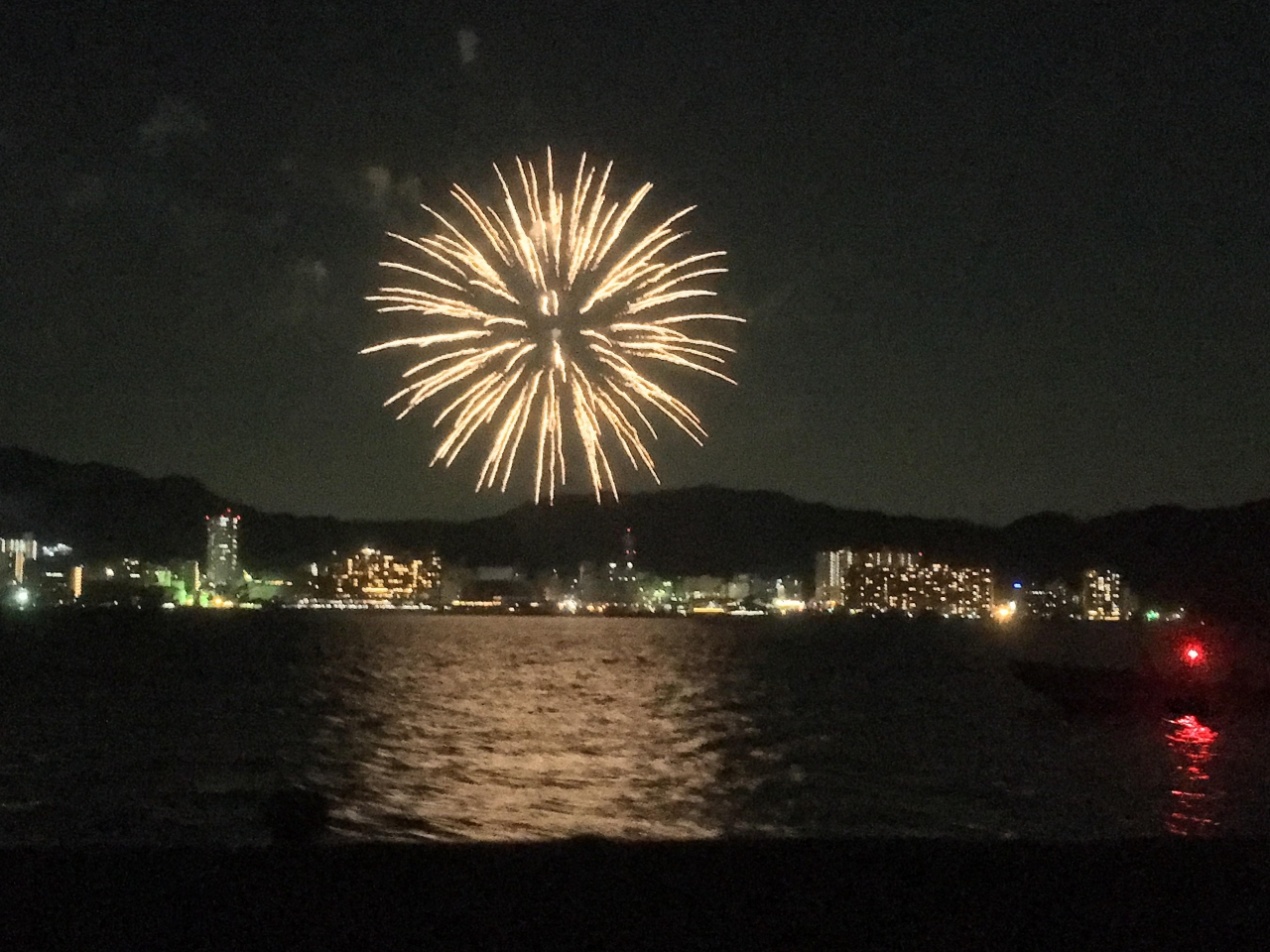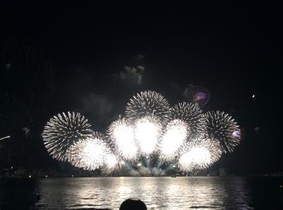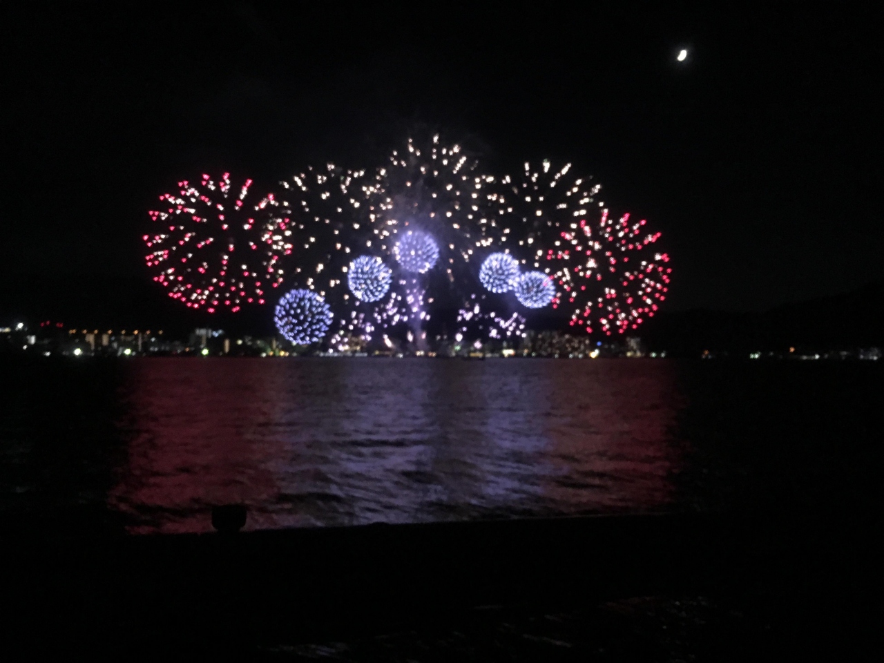 びわ湖大花火大会に招待頂きました。滋賀県のJR堅田駅から堅田港へ。堅田港から船で湖上に設営されている観覧席へ。台船の上に観覧席や屋台、トイレ、喫煙所が用意されており、360度見渡す限り琵琶湖で、観覧席の最前列から花火を正面に観覧できる絶好のロケーションでした。大津市の夜景を背景に花火が湖面に映って、まさに絶景でした!