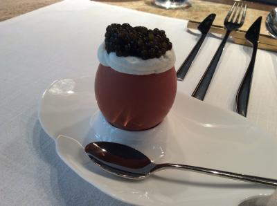 4800円のランチコースでしたが、エッグキャビア+4000円、飛騨牛+2500円、アルコール+4000円で、一人15300円の昼食となりましたが、味や接客には満足できました。けやき坂にこじんまりとした店舗があり、1階のカウンター席を利用しました。エッグキャビアは初めて食べましたが、トロトロのスクランブルエッグにキャビアがたっぷりとのせてあり、値段は別として最高に美味しかったです。