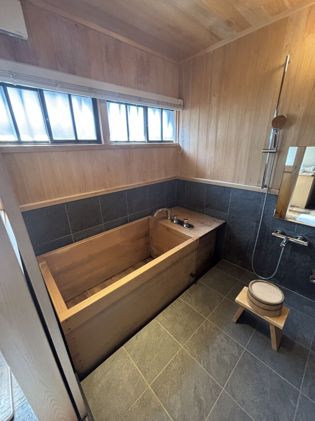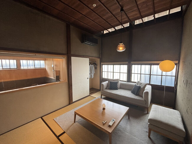 隣の和室にソファが置いてあり、カラス越しに檜のお風呂。