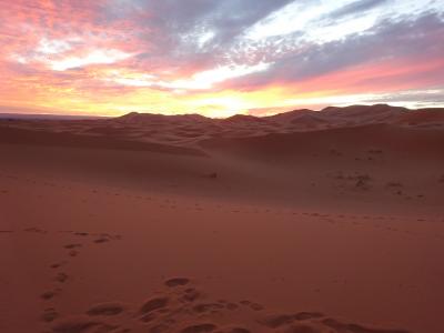 早朝5:30にホテルを出発し、ラクダに乗ってメルズーガ大砂丘に向かいました。VIVANTでみたような砂漠の景色を見ることができました。11月でしたが太陽が出ていないとすごく寒いです。ただ、日の出の時間帯だけに雲がかかってしまい、ご来光は見られませんでした。
