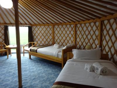 Wifi、テレビはありませんでしたが、ドライヤーと電気ポット、歯ブラシも用意されていて何不自由ありませんでした。冷房はありません。それぞれのゲルは、木道でつながっていてレストランまで木道のデッキで行かれました。