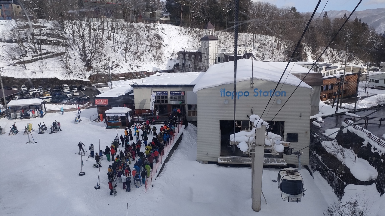 八方尾根の山麓から一気に兎平まで行かれます。6人乗りのゴンドラですが、コロナもあり、ぎゅうぎゅう詰めで乗車させていないので安心でした。天気が良いと白馬の町や山並みが一望できて良いです。ただ、1日リスト券が6,500円と他のスキー場と比べてダントツに高いのが難です。