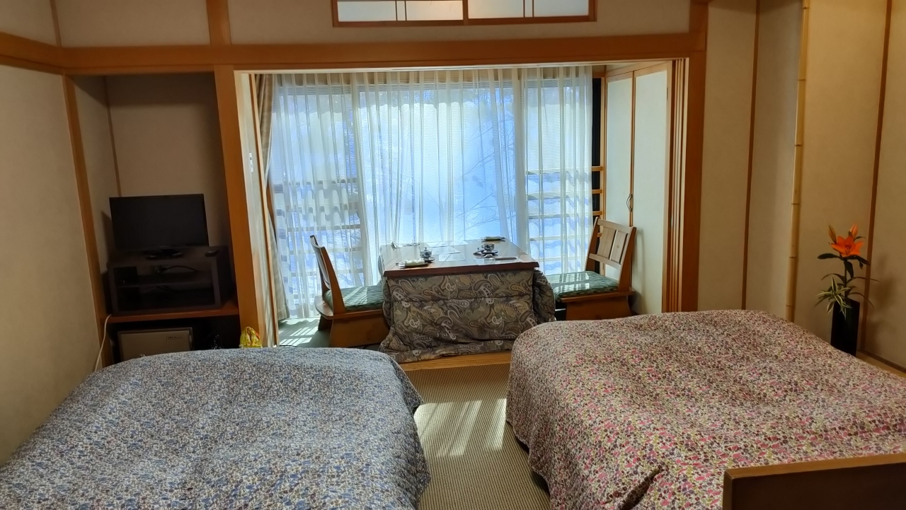 止まった部屋は、ツインベットのお部屋でした。テーブル式のこたつがありくつろげました。