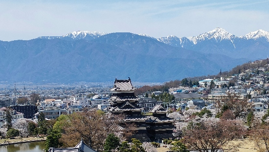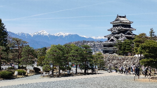 正面の入口から入ると、天守閣と北アルプスの両方がこのように見られます。