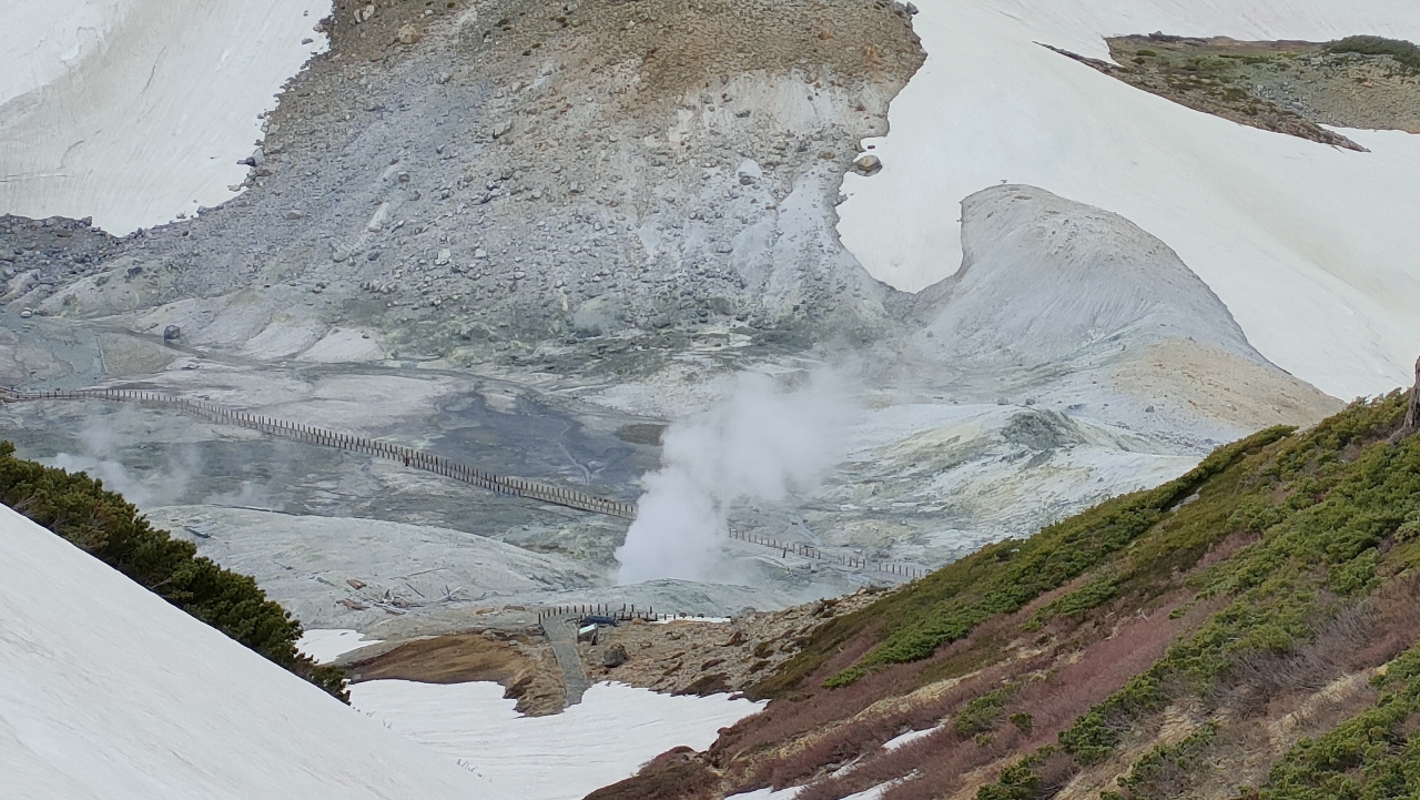 そこから徒歩約10分でミドリガ池に着き、更に3分ぐらいでミドリガ池温泉に到着します。ミドリガ池温泉の展望台からこの地獄谷がよく見えます。