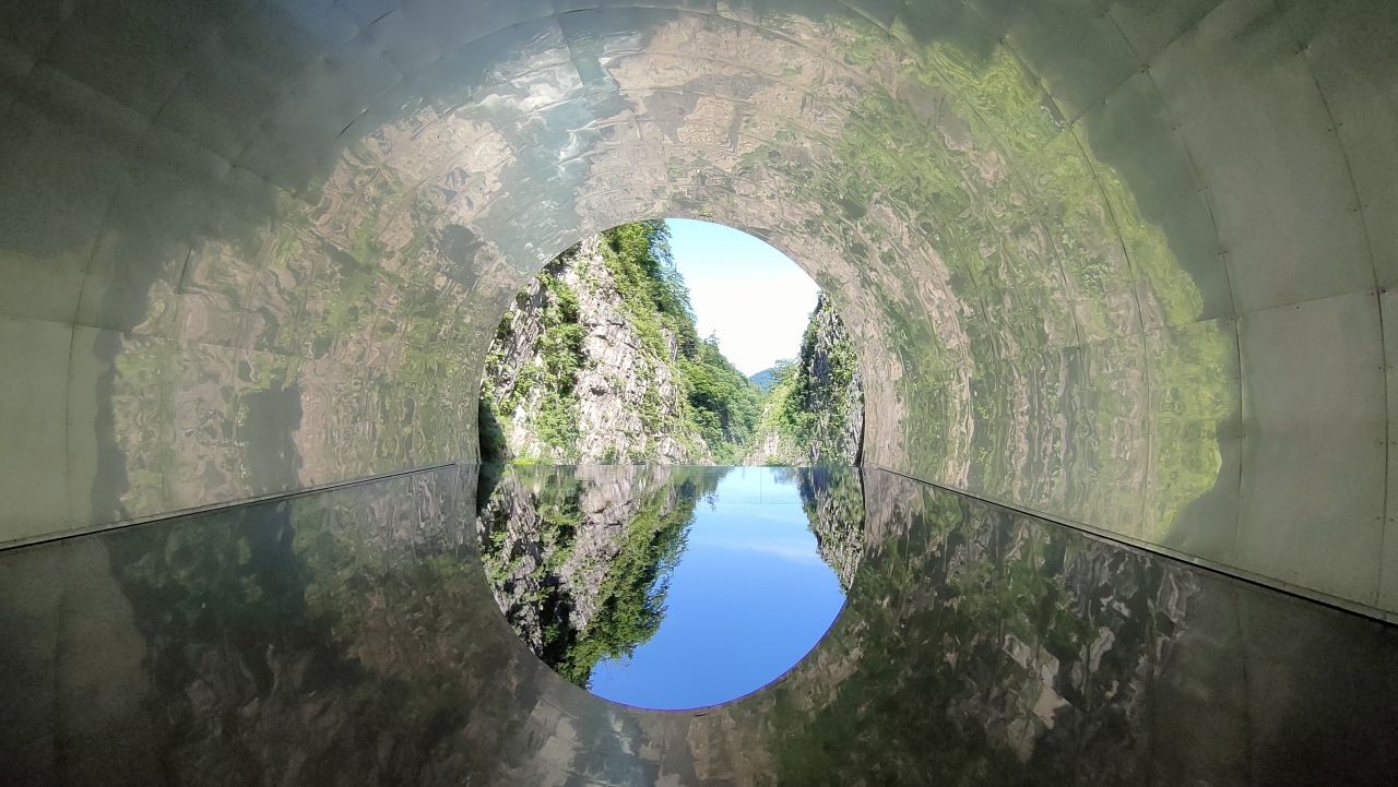 トンネルの終点がパノラマステーションになっていて、足元の水盤の反射で渓谷が写って綺麗でした。ちょうど行ったときには誰も水の中に入っていなかったので水面が揺れずにきれいな写真が撮れました。