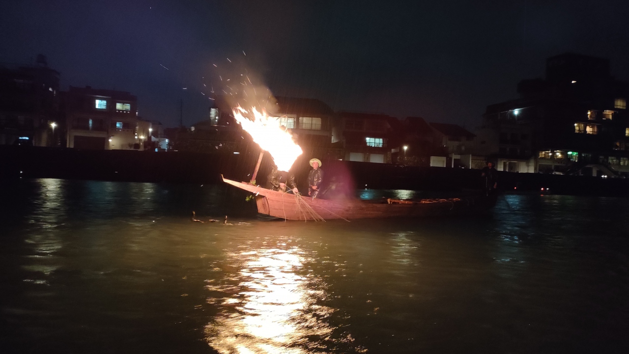 19:15の船は大型の船で飲食ができない上、小回りがきかないので鵜の取り回しなど細かなところに近づいて見ることができませんでした。