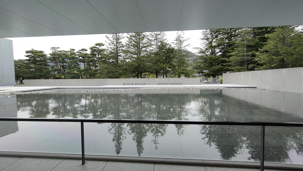 長野県立美術館の隣りにあるのが「東山魁夷館」です。東山魁夷の作品が沢山展示されています。独特なグリーンとブルーの淡い作品「緑響く」はもちろん、奈良の唐招提寺の襖絵のデッサン画がたくさん展示されていました。中国の山水画を墨絵ではなく絵の具で描いているのが特徴です。