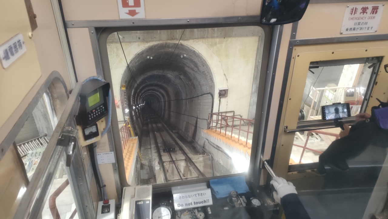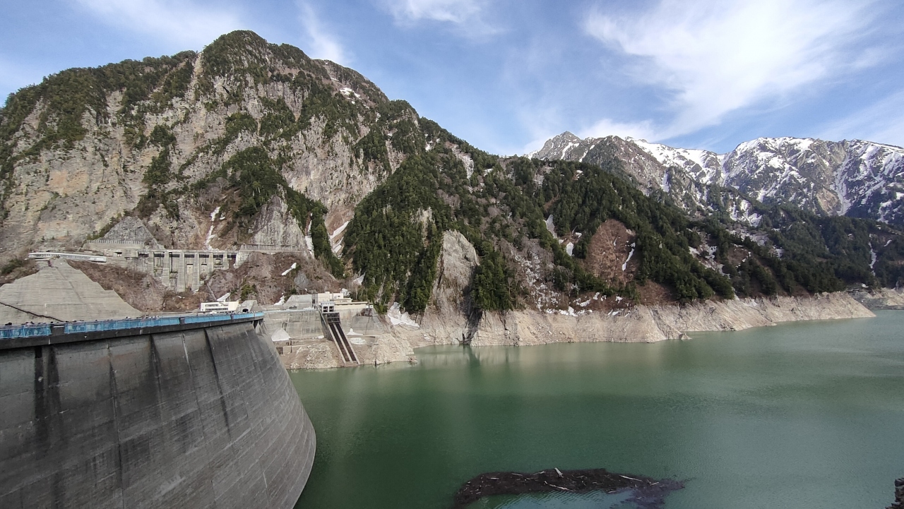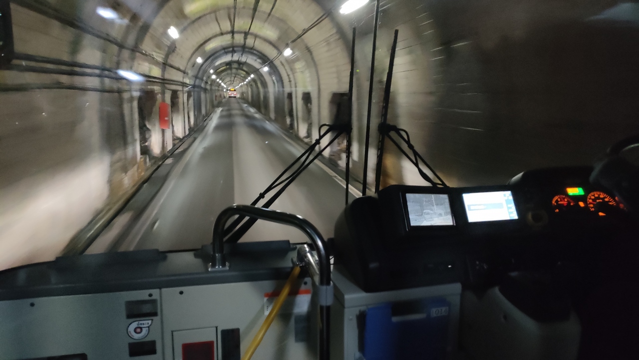 扇沢から黒部湖に行くのにこの電気バスに乗りました。前に来たときはトロリーバスだったのですが、2018年に電気バスに変わったそうです。4台ほど連続して運行され、約6分でダムに着きました。このトンネルの真中には大きな破砕帯があって、ここで大規模な出水があり、そこだけで13ヶ月もかかる大工事だったそうです。