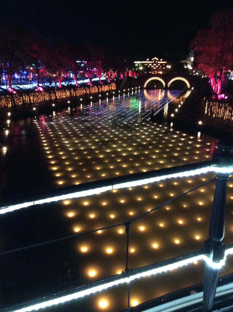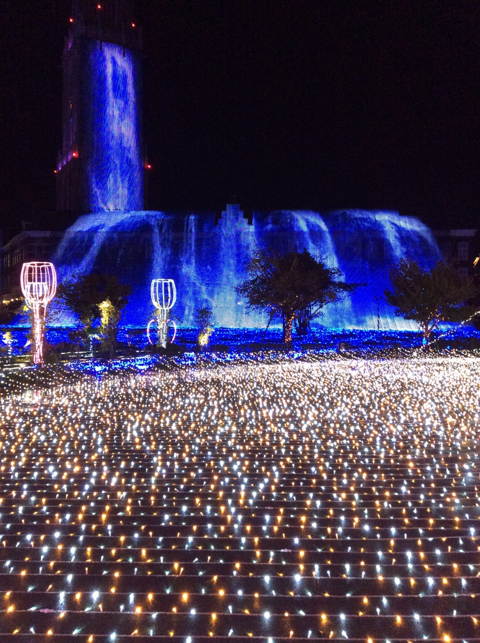 確かにイルミの規模の広さはすごいと思いました。運河の水の中までイルミなのはビックリでした。テーマを作ってそこここでイルミを使っています。タワーから流れる光の滝が今年の目玉の様で、TVでは青白いLEDの綺麗な滝でしたが、実際は時間で赤くなったり結構カラフルな処が多くてイメージと違って見えました。