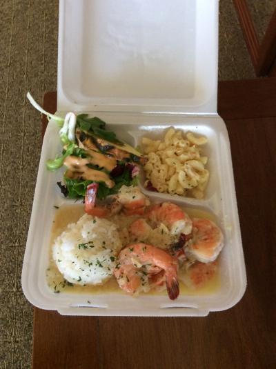 ポテトサラダとガーリックシュリンプとライスのセットですが、$13.99でした。