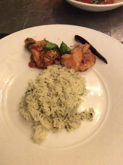 エビの揚げ物と野菜のあんかけ、パリパリ麺のグリーンソースを2人でシェアしてパンナコッタとエスプレッソ一人づつミネラルウォーターのLサイズ1本(最初Sを2本頼んだらL1本がお得よ!と教えてくれました)頼みました。