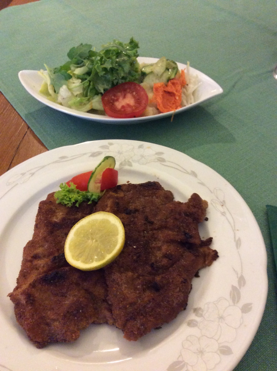 アップルジュース、ポテトサラダ、牛カツレツで税込(19%)20€弱でした。