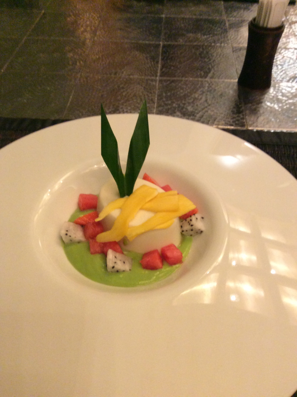 エビの揚げ物と野菜のあんかけ、パリパリ麺のグリーンソースを2人でシェアしてパンナコッタとエスプレッソ一人づつミネラルウォーターのLサイズ1本(最初Sを2本頼んだらL1本がお得よ!と教えてくれました)頼みました。