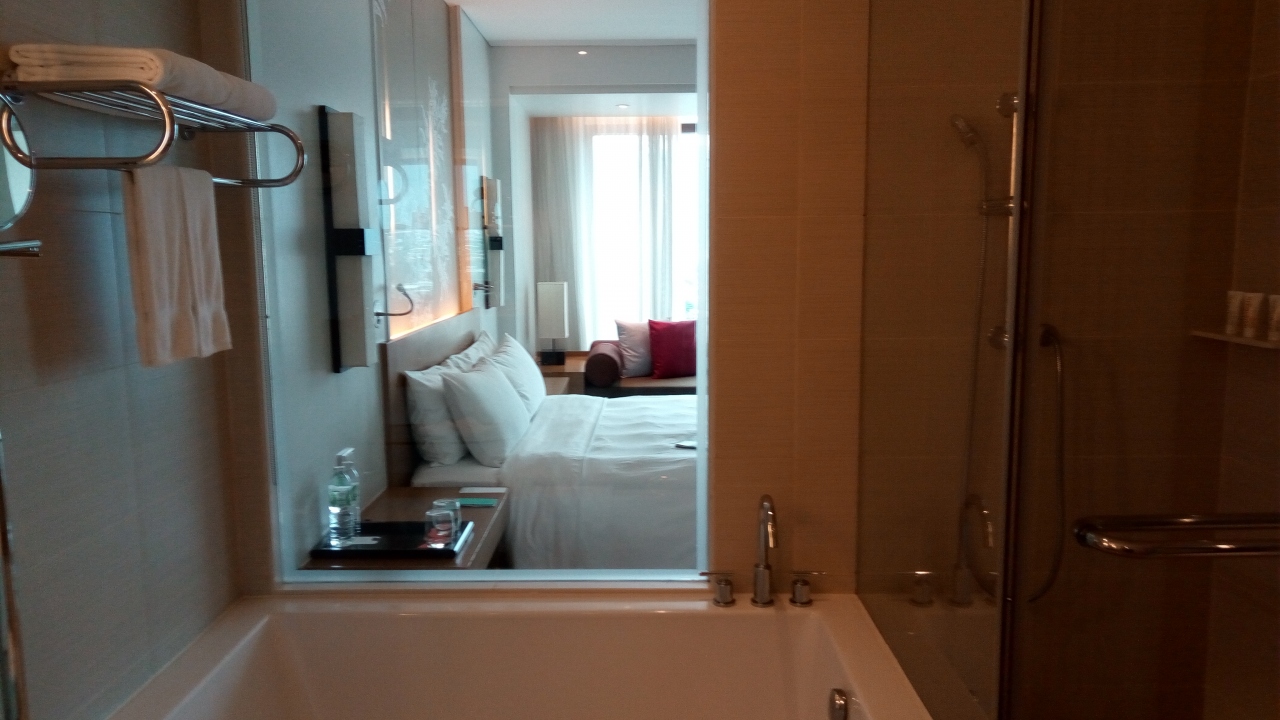洗面台も大きい、シャワーブースとバスタブがそれぞれ独立しており、バスタブにはTVもついています。