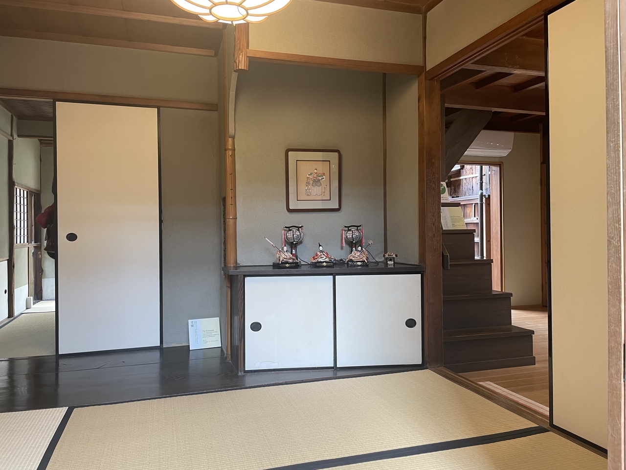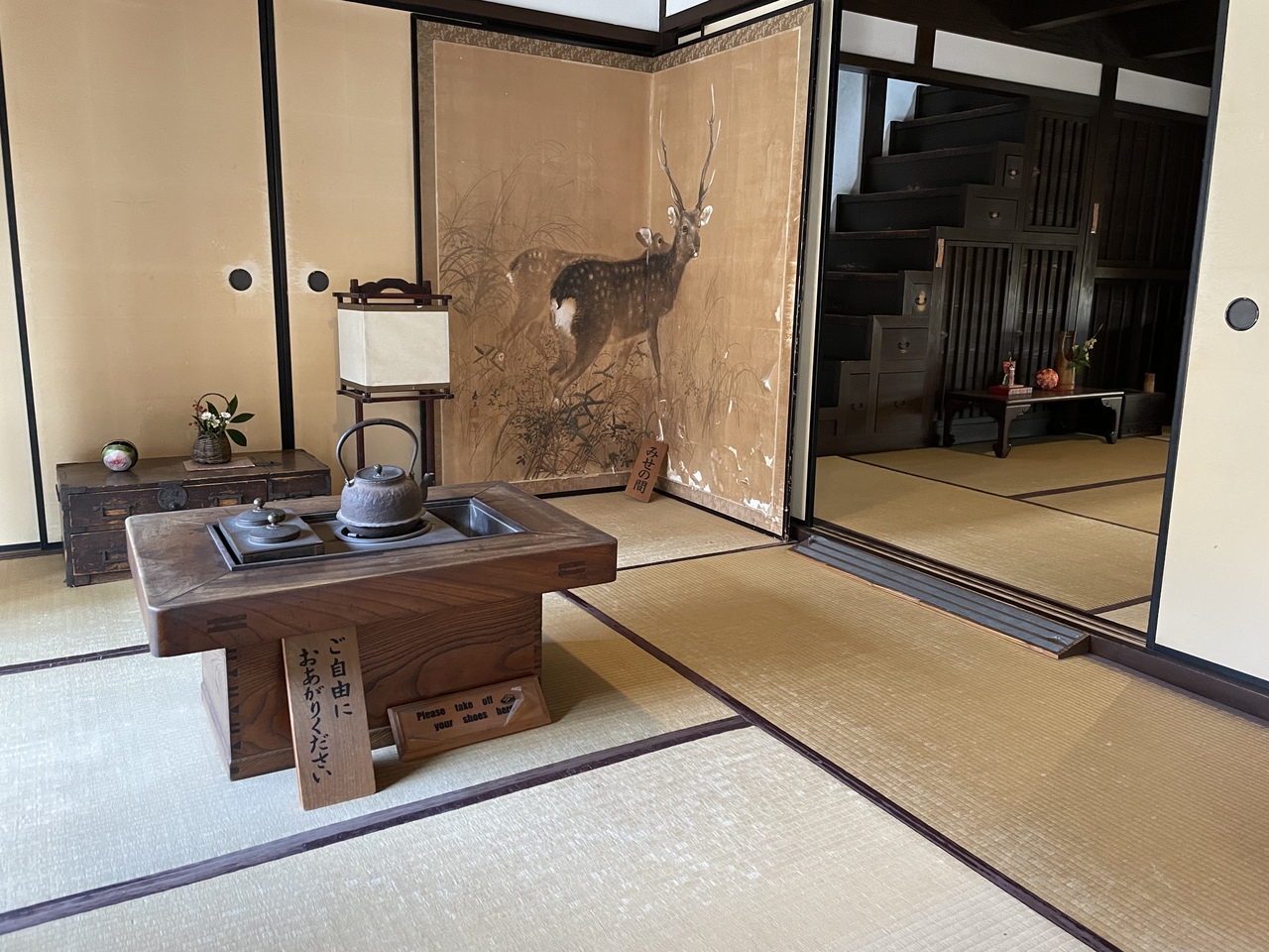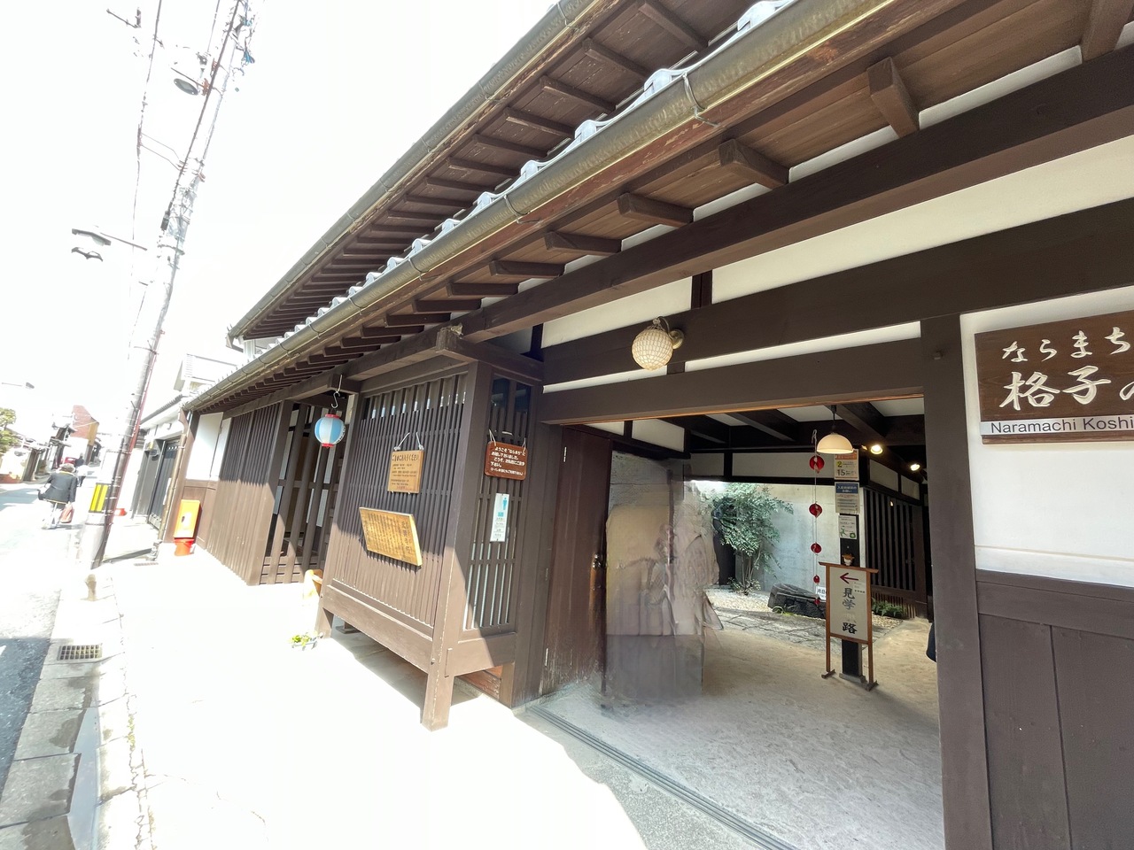 ならまち観光の要所、間口が狭く奥行きのある昔の町屋を無料で見ることができる施設。名前の通りの格子が使われた空間に箱階段や調度品と古い物が大切に保存され、さらに手入れされた美しい中庭とならまちならではの風情があります。