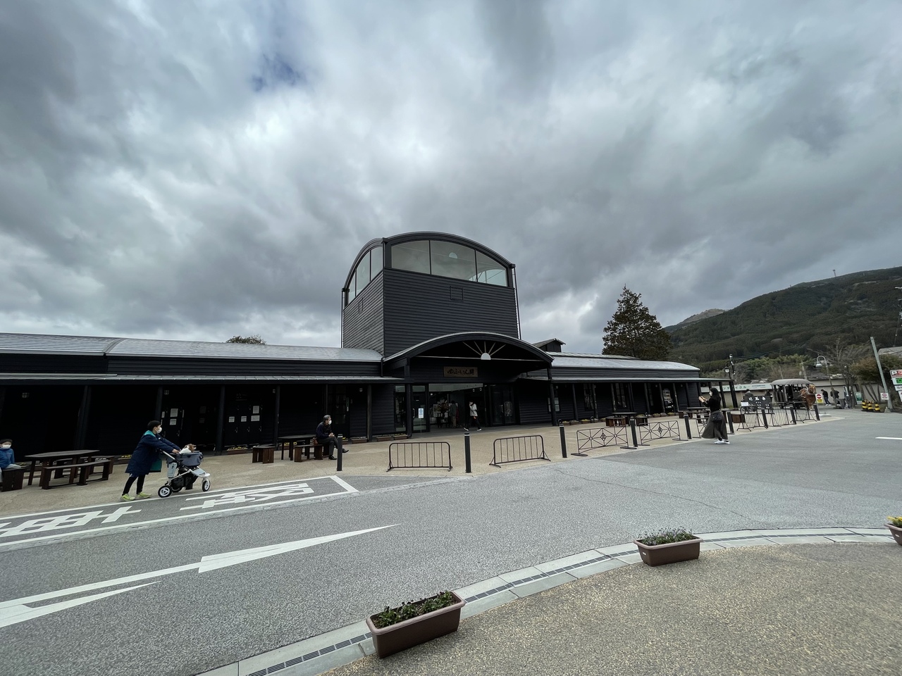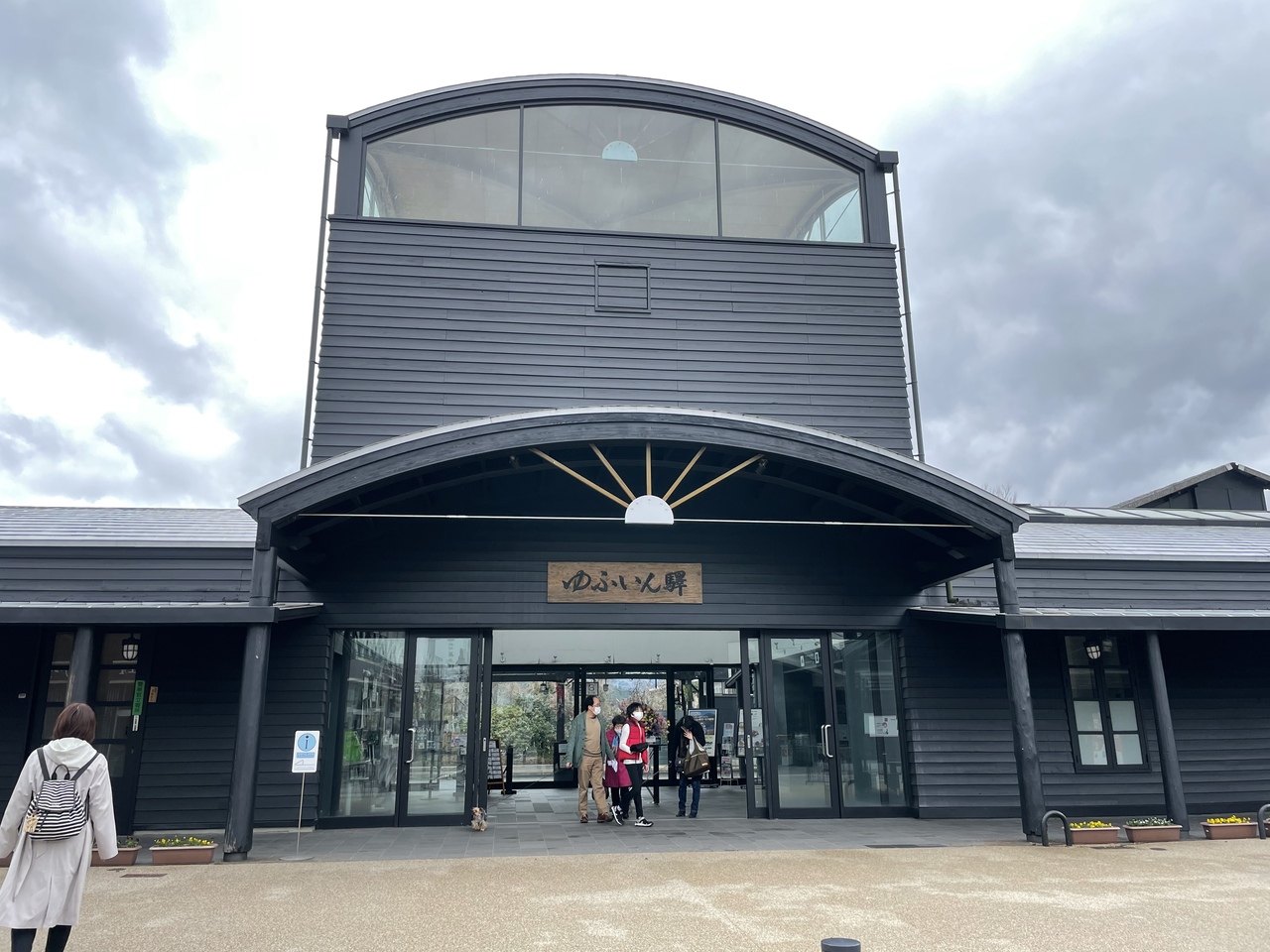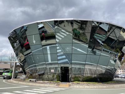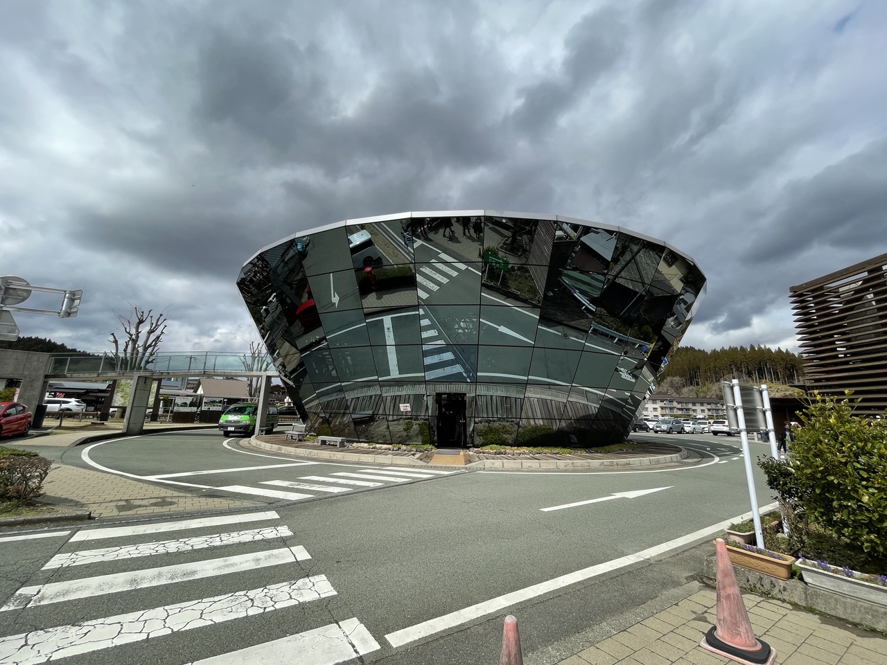 熊本の北、大分県との境、国道沿いにひときわ目立つ全面総ミラーガラス張りの台形を逆さまにしたような変わった建物で、中は道の駅とギャラリーとインフォメーションセンターがあり、地元のお土産などが買える小国町のシンボル的存在。