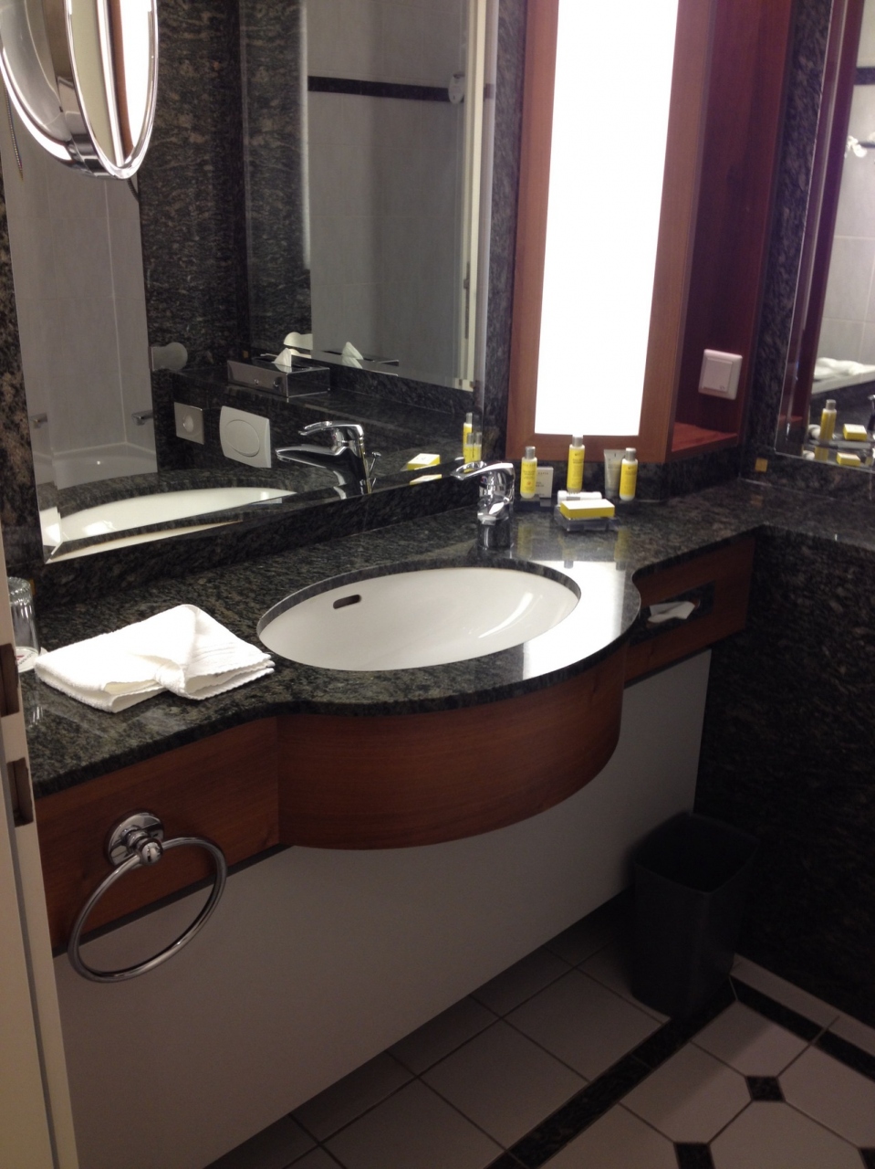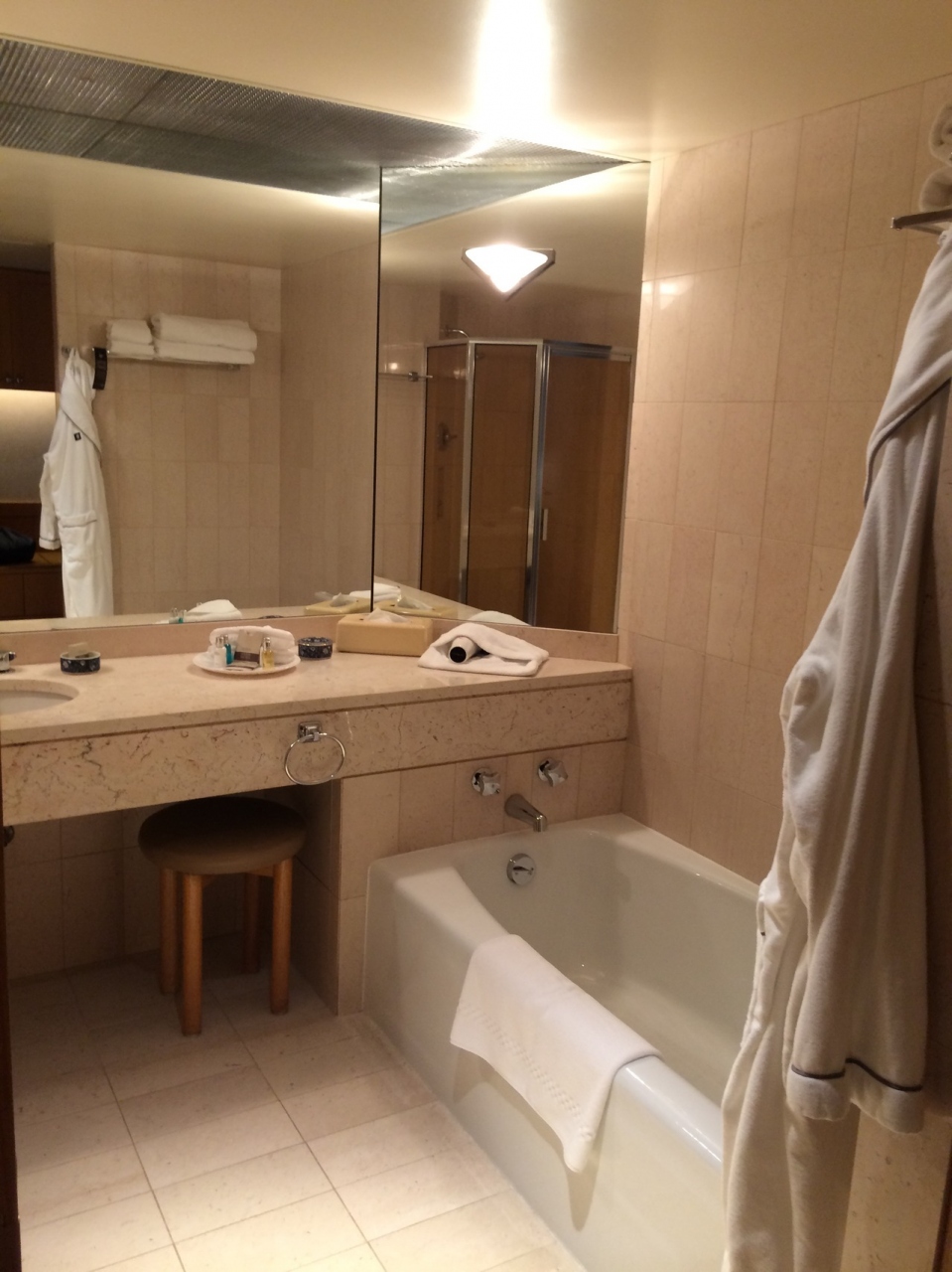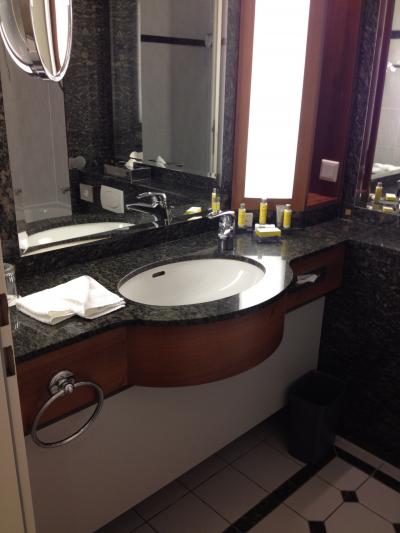 部屋はダブルルームでも広々した感じですが、バスルームはもう少し余裕が欲しいのと、部屋にバスローブがないのが残念。でも、一通りのアメニティにバスタブもあり、その他は満足です。