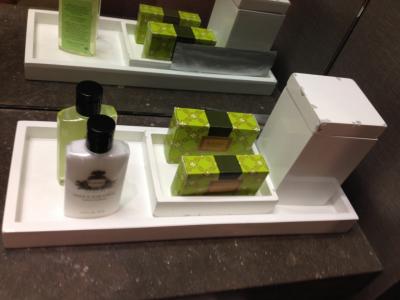 アメニティは、シャンプー、リンス、ボディシャンプー、ボディローション、ボディソープ、フェイシャルソープ、ソーイングセット、コットン、靴磨き、綿棒、爪磨き。