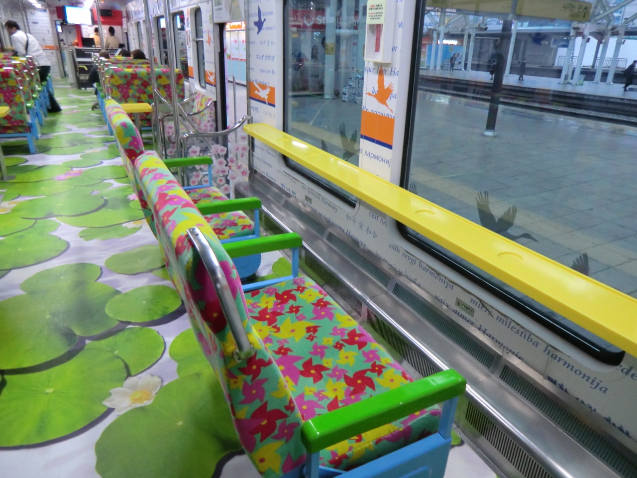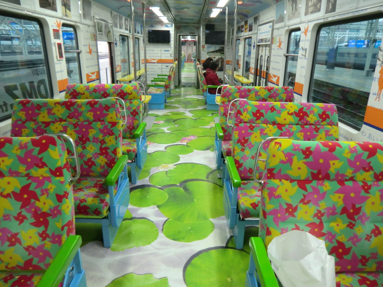列車は3両のディーゼルカーで、元は通勤列車として使用していた車両の余剰車を観光列車用に改造された、韓国らしい派手な内装で売店・トイレが設置されています。