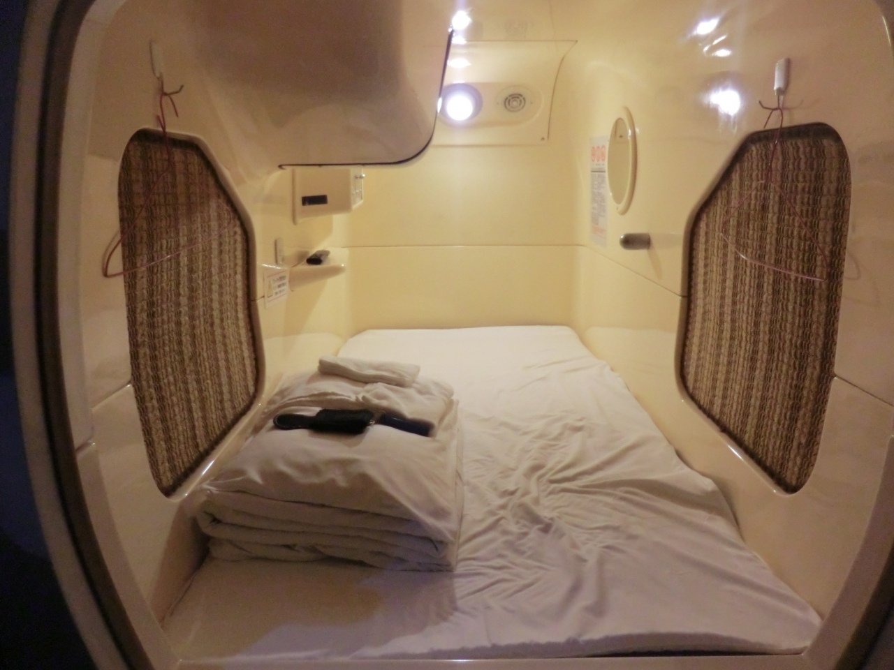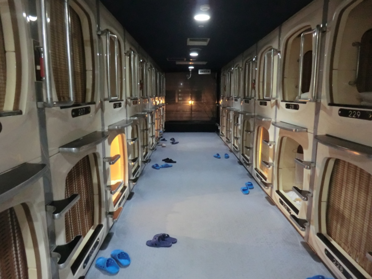 ロッカー脇のガラス扉を開けると、蜂の巣のようにカプセルが並んでおり、ロッカーと同じ番号の指定されたカプセルに入ります。