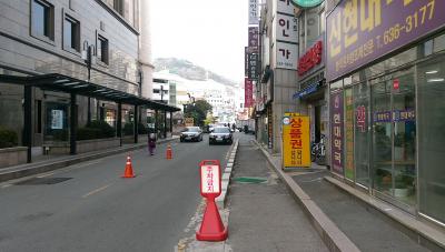 店のおばちゃんが「冷麺サービス!どこも同じ‥」とカタコトの日本語で客引きをしています。