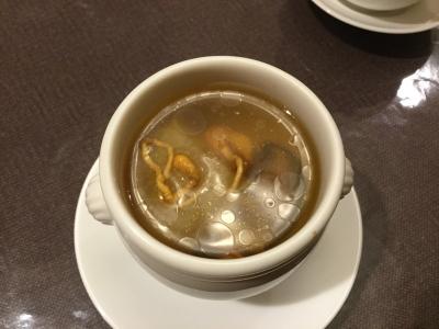 はじめにライチ茶が出て、本日のフカヒレスープ、2段重ねのお弁当、ご飯、デザートと続きます。