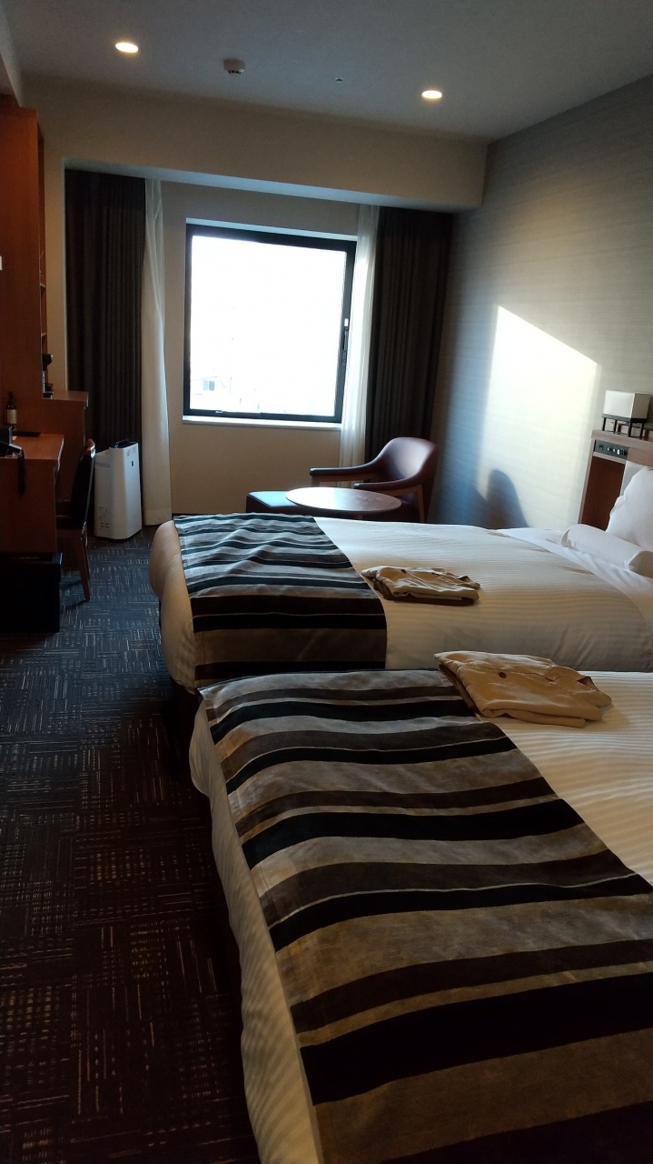 ビジネスホテルだけど、部屋は広め。浴室も広い。バスタブは浅くて長い。