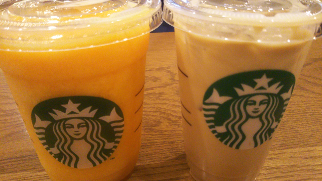 今日は暑いので、スタバラテ(アイス)とマンゴーパッションティーフラペチーノ。