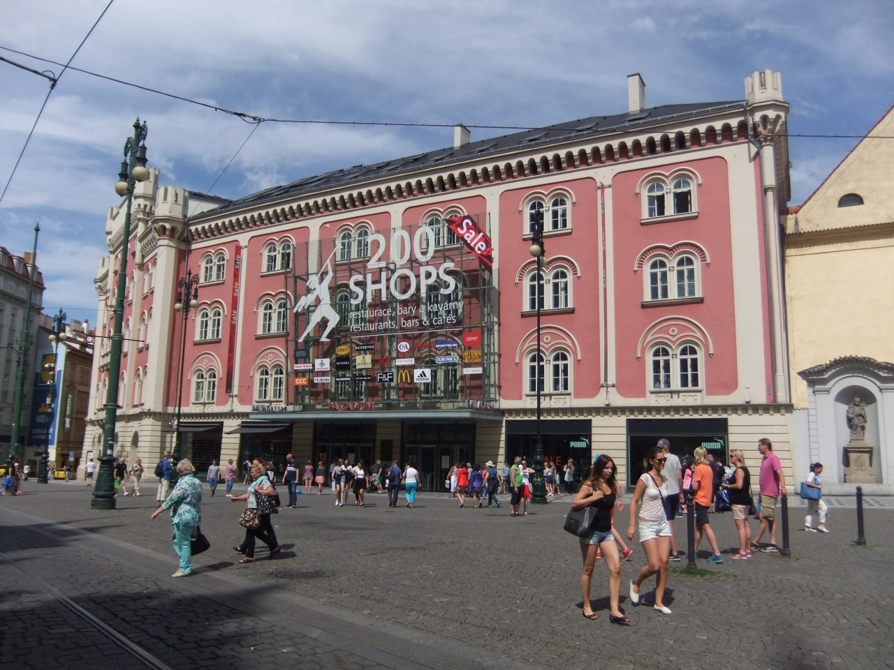 この建物は、ティーン教会の横、「石の鐘の家」の続きに見えるピンク色の建物。