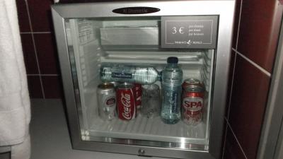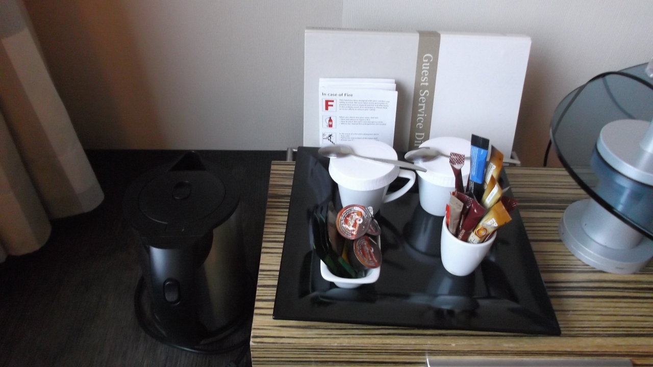 ホテルの部屋は、狭いですが、工夫して、最小限の設備はあります。 冷蔵庫が無いと思ったら、バスルームの洗面台の下に見つけました。 使い捨てのプラカップと飲み物が入っていました。 それ以外の食器は、ありませんでした。