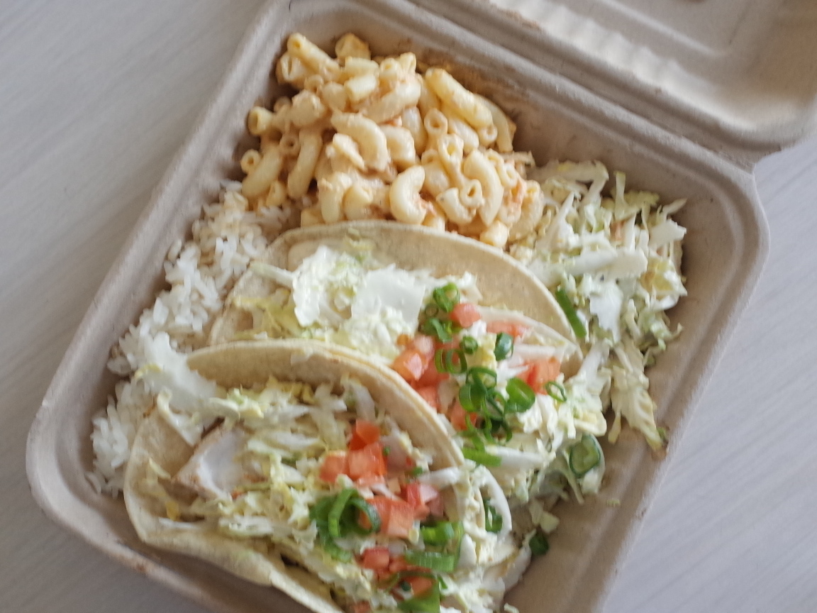 2タコプレート$11.95フィッシュにしました。ハワイでは野菜不足になりがちですが、プレートランチでこんなに野菜が入ってるのははじめてです。