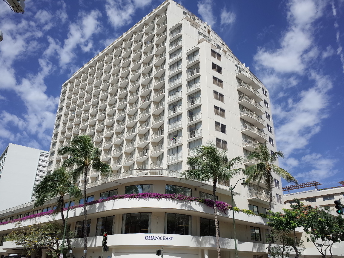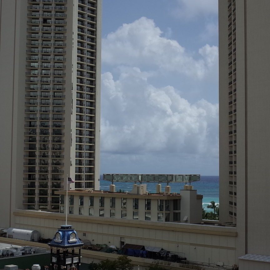 部屋は十分広くて、2棟のハイアットの間からほんのりパーシャルオーシャンビュー。