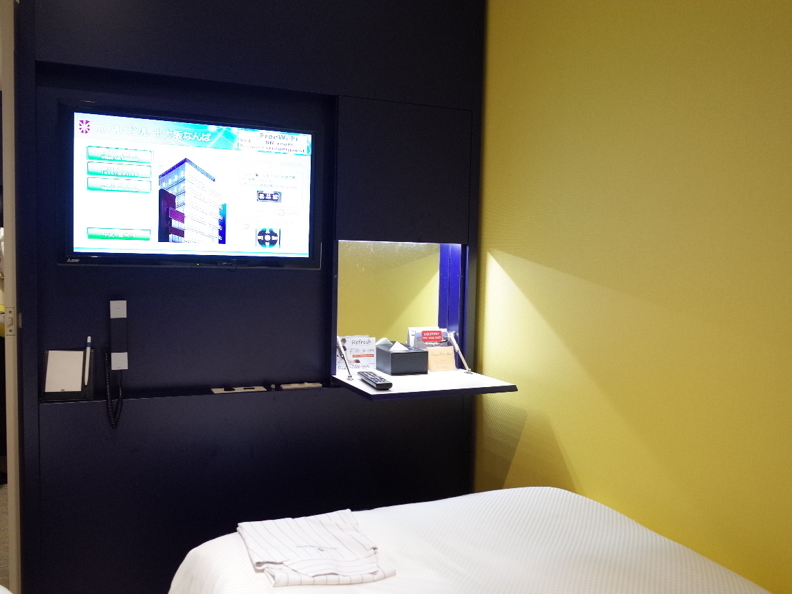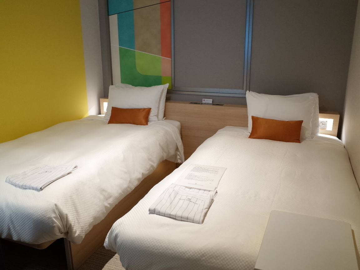 部屋は、シングルスペースにツインベッドが置かれたよう超コンパクト。ベッドかためで良好。バスルームも狭いけど、湯船深めで良好。