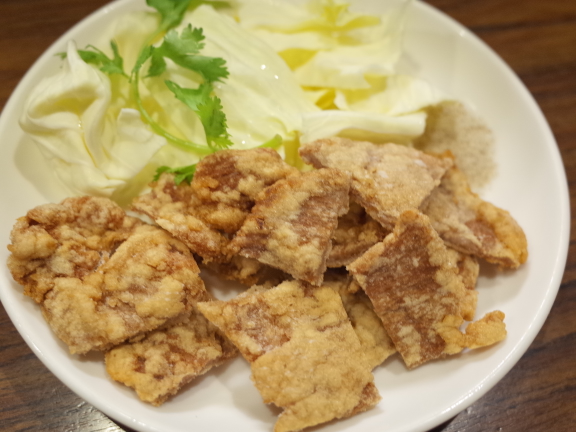 合鴨皮の醤油煮はめちゃうまい。豚の天ぷらは塩で、つけあわせのキャベツまでメインに感じるうまさ。こぶりの餃子もおいしい。