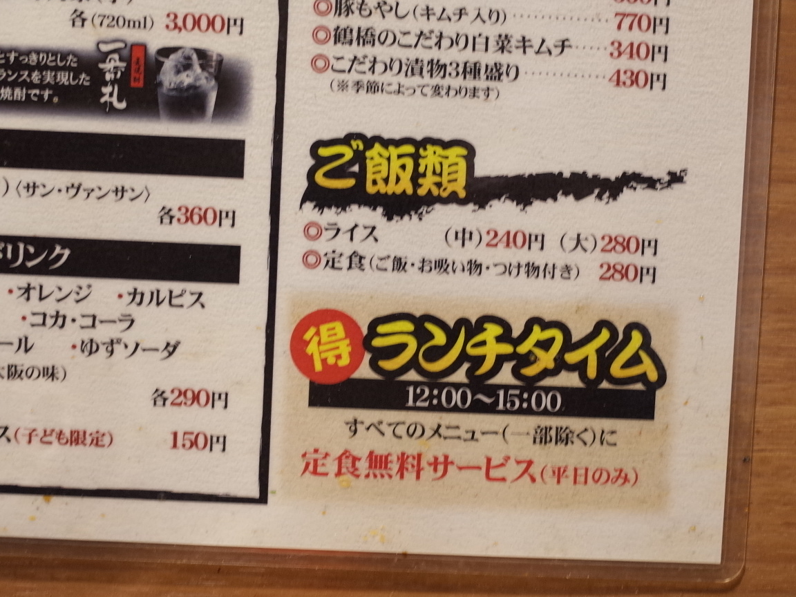 平日ランチタイム(12:00~15:00)は定食無料でお得。