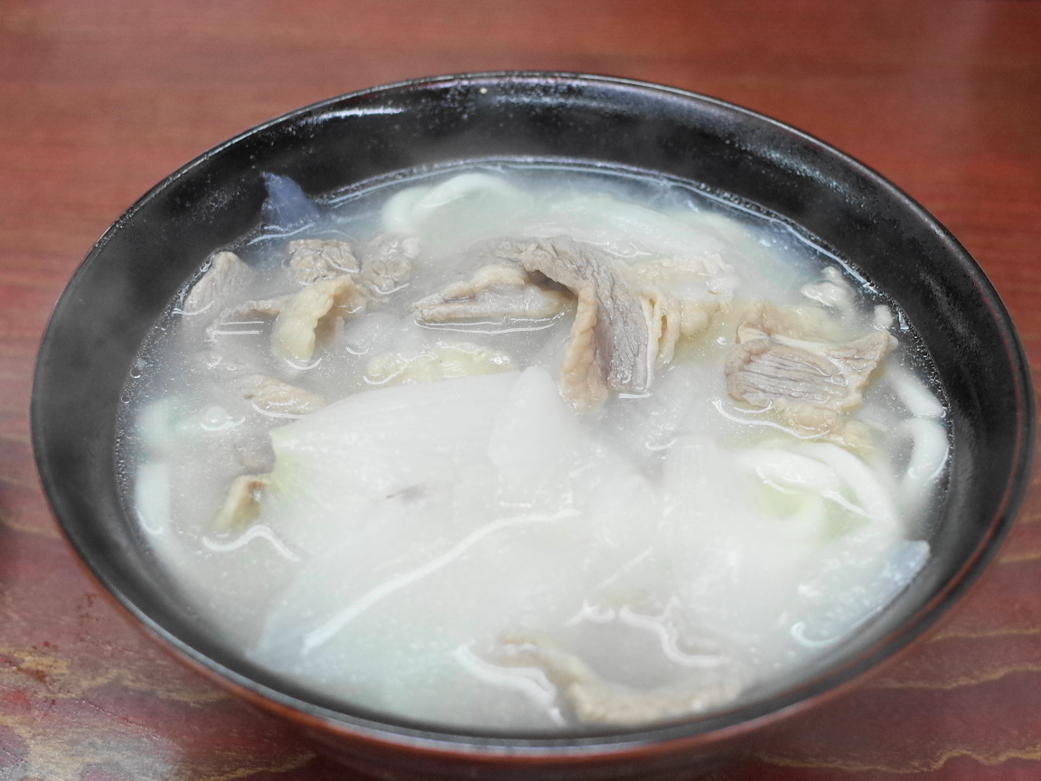 透明なさらさら特製シチューは、塩味でタマネギじゃがいもすじ肉がたっぷり。