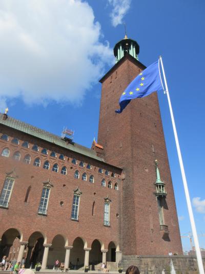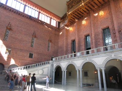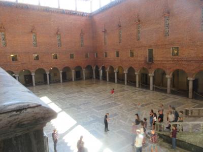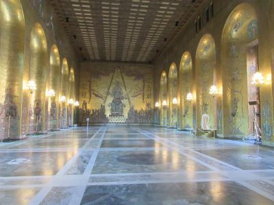 ノーベル賞受賞者の晩餐会が青の広間で行われ、舞踏会が黄金の間で行われることで有名。青の広間は思っていたほど広くなく、1300人の人が食事をするのは大変そうに思う。実際に一人分のスペースは60cmだそうでかなり狭い。黄金の間は金箔が貼られていてまさに黄金の光を放っていた。地下のレストランでノーベル賞受賞者と同じメニューで食事ができるが、かなり早くから申し込まないと予約は取れない。