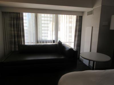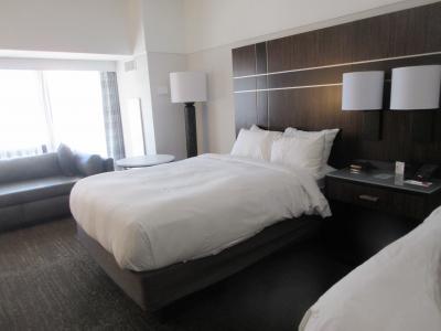 タイムズスクエアの角の所にあるので観光にとても便利。賑やかな場所であるが8Fから上の階がホテルになっていて静かだった。8Fのロビーまで行くエレベーターにはルームキー無しで乗れる。1Fのタッチパネルに触れるとどのエレベーターに乗ることが出来るかが表示される。円形状に複数のエレベーターがあり、全体が見えないので、乗ることが出来るエレベーターを探すために速足をする必要があった。ルームキーでタッチした場合も同様に乗ることが出来るエレベーターを探す必要があった。25Fの部屋からは摩天楼が見え、摩天楼の中に宿泊した感じだ。