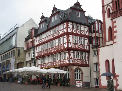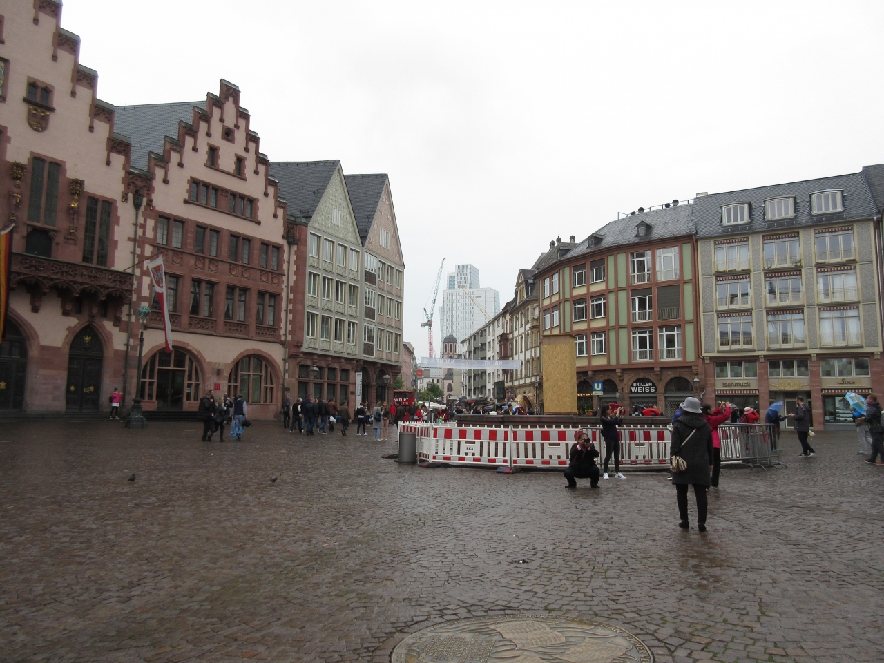 マイン川に近く三角屋根の旧市庁舎がある石畳の広場。ゲーテハウス、大聖堂、歴史博物館へは徒歩圏内で行くことができる。木組みの家が広場の周りにたくさんありドイツに来たと思える景色が見られる。街の中心にある。