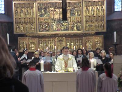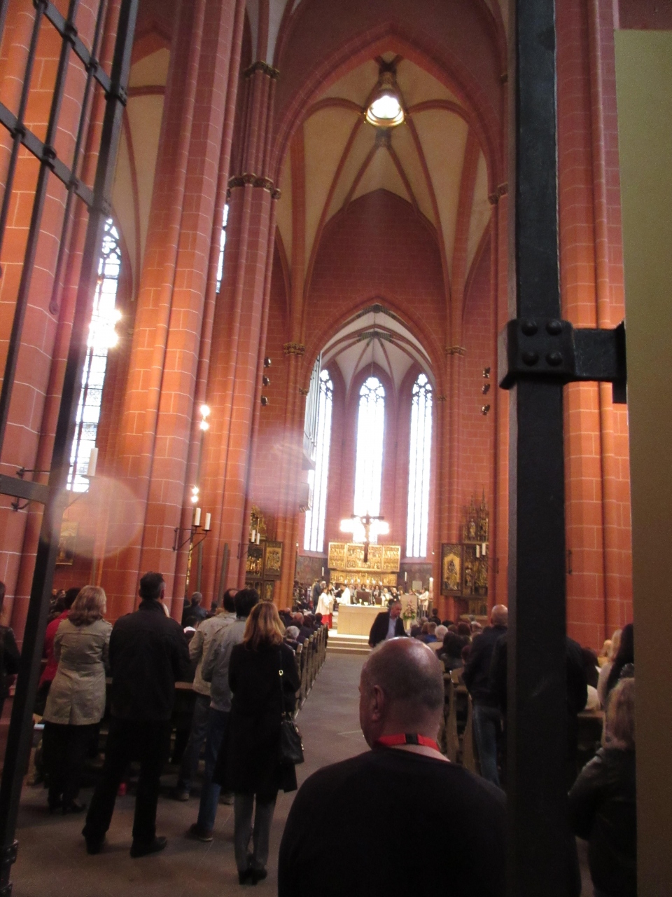 フランクフルトの町のほぼ中心にある。茶色の高い尖塔のある教会。見上げるとかなり高く、空を突き刺しているように感じる。13~15世紀にかけて作られたバロック式の教会である。日曜日に訪れたところ日曜礼拝を多くの人が集まって行っていた。地域の教会であることを実感した。