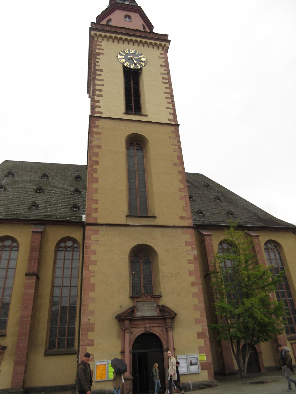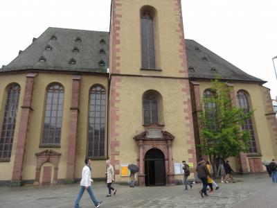 ゲーテハウスからUバーンのHauptwache駅へ向かう途中にある。ベージュを基調にし、窓枠の茶色がアクセントになっている可愛い感じがする教会。最初は教会には見えなかったが周囲の建物とは明らかに構造が違う。ゲーテが洗礼を受けている。