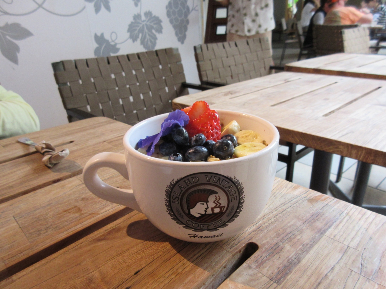 ロイヤルハワイアンセンターのCビルディングの2階にある。1階から上がるエスカレーターを上ると目の前がお店でわかりやすい。ロイヤルグローブでのフラレッスン後の休憩で利用した。名物のアサイボウルは大きなカップに一人では食べきれない量が入っている。かなり混む。番号札をもらいテーブルで待っていると注文した物が届く。