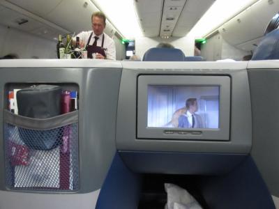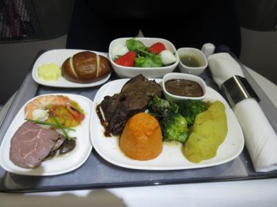 ラウンジで夕食を取ろうと思って行ってみると品数が少なくて驚いた。酒の肴の範囲。しかし、機内食はおいしかった。足下が両サイドから次第に狭くなり三角形のような形で先端は狭く寝返りを打ちにくい。CAは年配の男性であったが日本語を正しく話せた。